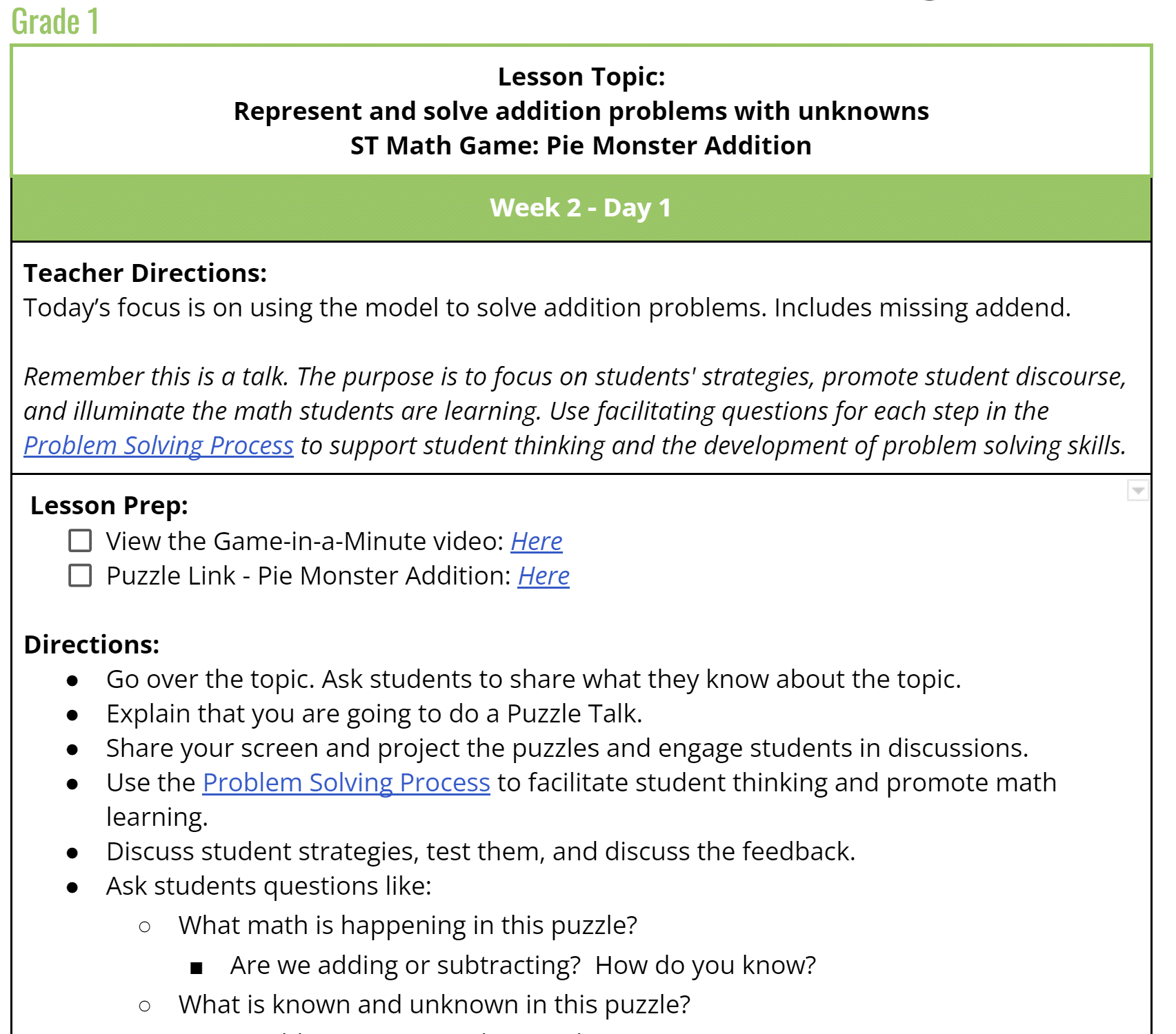 Review the ST Math Camp: Journey Lesson Plan for the Grade needed and: