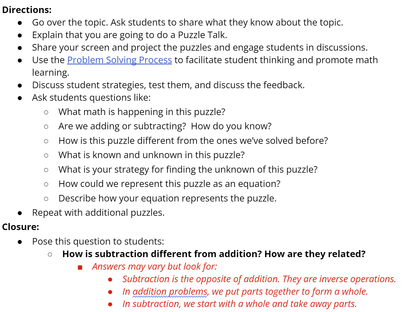 Watch the video of a teacher conducting a Puzzle Talk. Notice how she uses the Problem Solving Process to make her students' thinking visible and supports them with language to help them communicate their ideas.