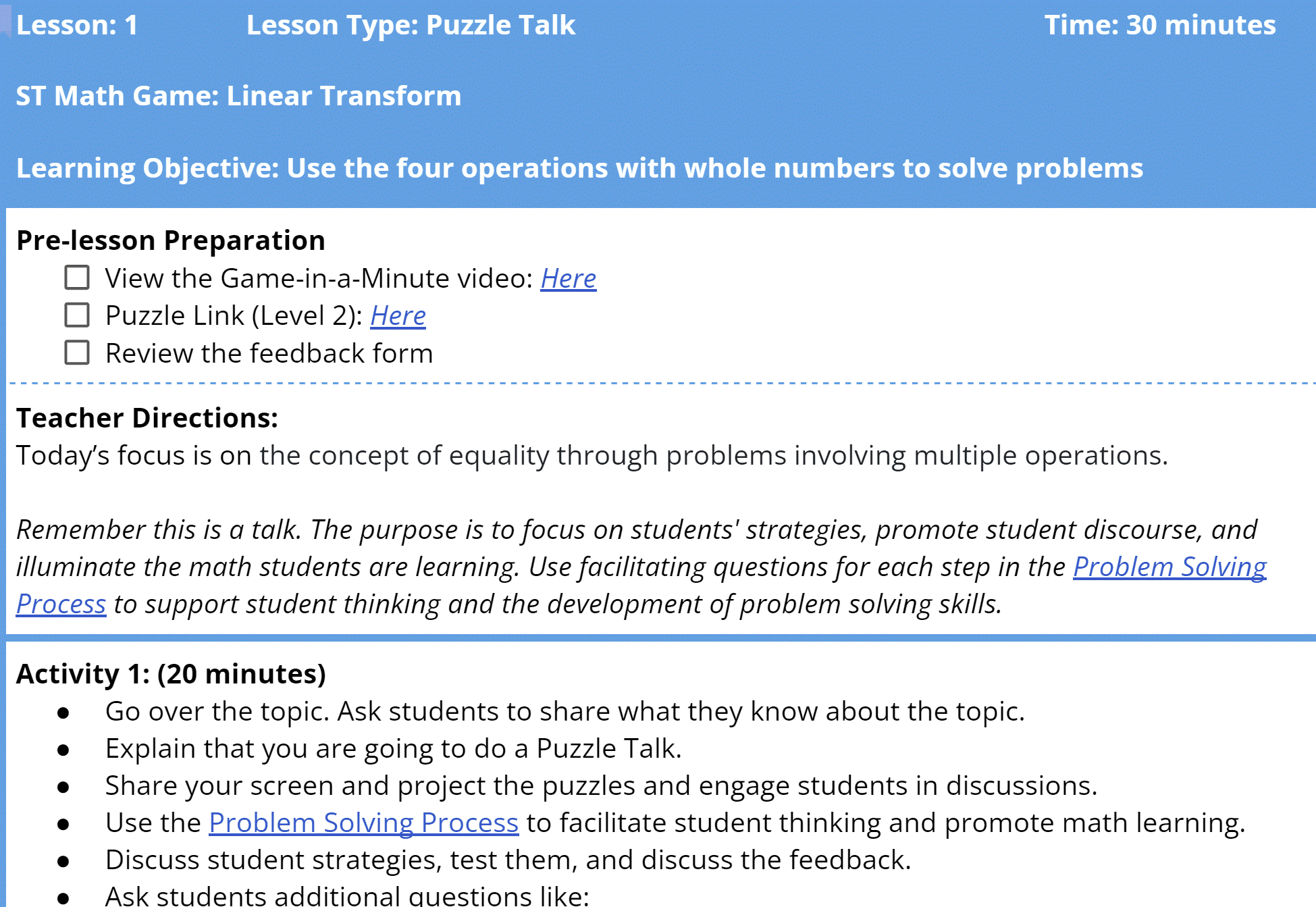 We recommend tutors play the ST Math puzzles themselves before engaging students in a Puzzle Talk. This will help anticipate the mathematics that students will bring to the conversation during the Problem Solving Process.